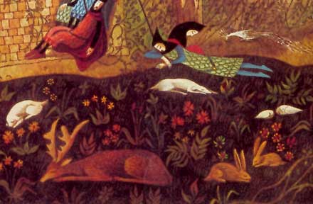 Here is a closer look at the Errol Le Cain version. It reminds me of a tapestry, especially those flowers in the grass: