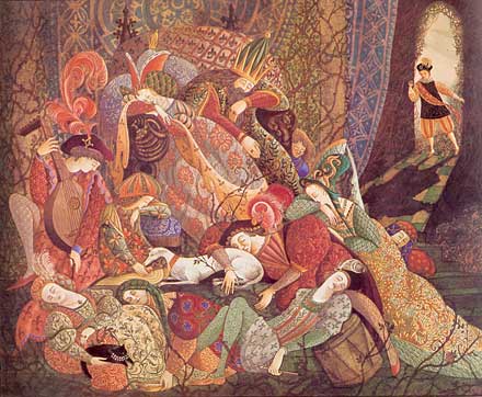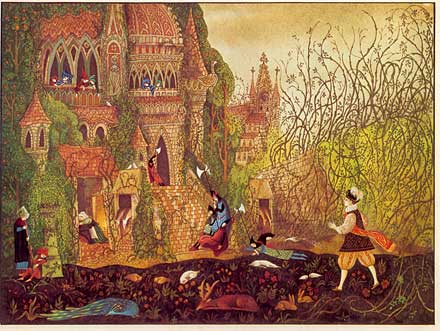 Once she falls asleep, the entire castle is stricken with the magical sleep. Here you can see the prince finding the castle after it has been asleep for a hundred years.