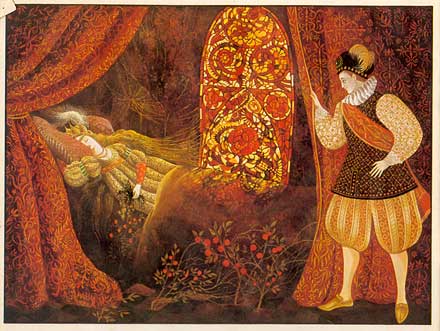 And here, at last, he finds the Sleeping Beauty. Notice her hair has been spun into the spiderwebs, and the stained glass shadows on her blankets.