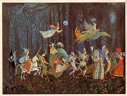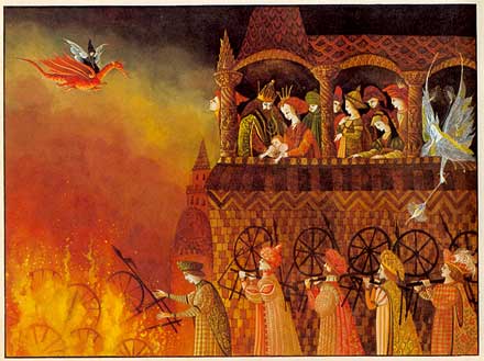 Beauty’s parents attempt to avoid fate by having all the spinning wheels in their country destroyed. Notice the evil fairy overlooking this, sitting up there on her little dragon, while the good fairy sadly looks on the destruction.