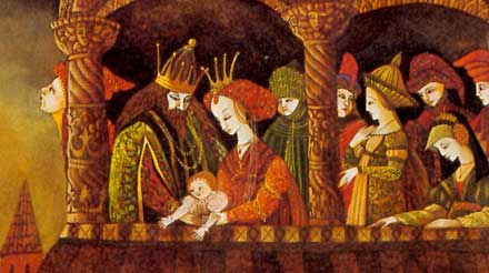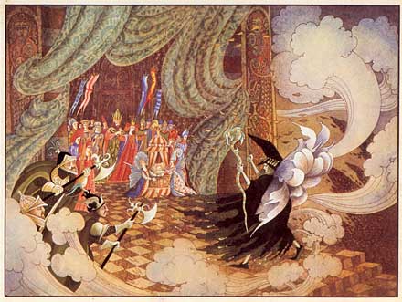 This one shows the arrival of the evil fairy at the christening. She is furious at being left out. You cant see it so clearly in this picture, but she is surrounded by autumn leaves, a nice contrast to the springtime of the “prima vera” fairies.