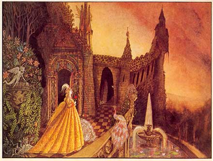 This is one of my favorite scenes. Beauty grows up, and the eve of her 15th birthday she wanders about in unfamiliar parts of her home. Can you see the little devil-fairy-imps that surround her?