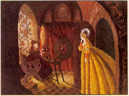 She finds a strange little room, with a strange little old lady, sitting at the spinning wheel. In the image its a bit small, but the shadows on the floor are particularly lovely.