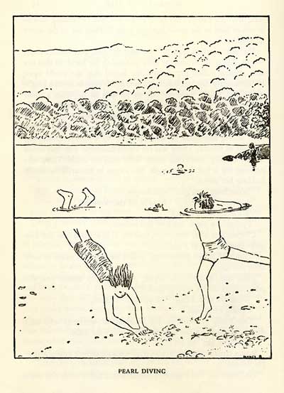 The children invest everything with a sheen of adventure and the most everyday event becomes an act from a storybook. In the picture below, Titty teaches Roger to swim just off the shore of the island they are camping on. They pretend to be diving for pearls, which are actually just white pebbles.