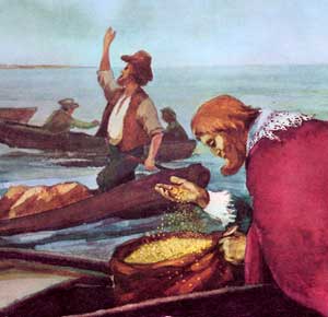 Finally he finds a cargo of golden grain. He looks at the seeds and sees their potential, for growth and for feeding many hungry people. This is the most precious thing he has seen, and he loads his ship with grain.