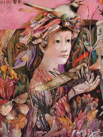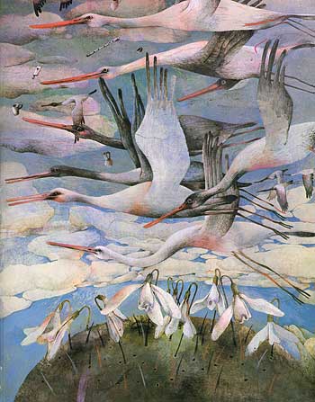 Here is a scene from March, which in this book is early spring. (Where I live March is early autumn.) You can see the flowers just emerging from the ground, and the birds returning: