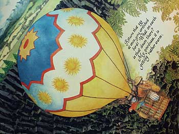What used to be a sun pattern on Miss Fanshaw’s balloon in the previous page, is now the sun itself, peeping through a hole in the forest canopy.
