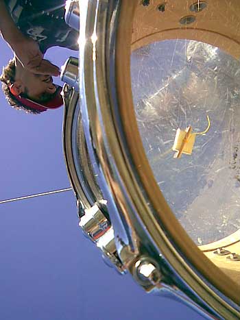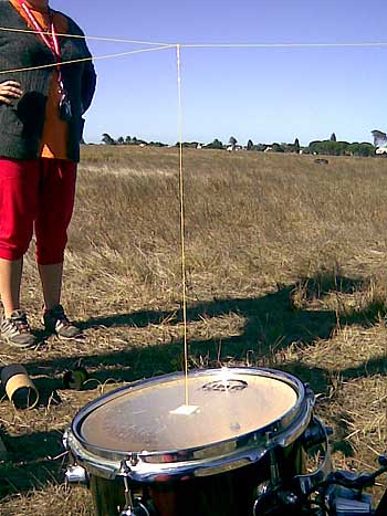 Attach a resonating surface to the line – this could be a bucket or plastic container simply hanging from the line. The vibrations that the wind creates in the line will pass into the resonator, and become more audible. We also used a drum, which worked very well.