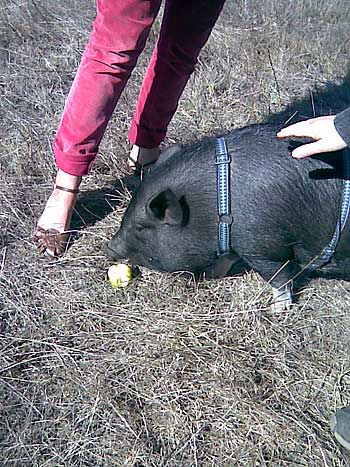A young black pig being taken for a walk. She headed for our recording equipment: