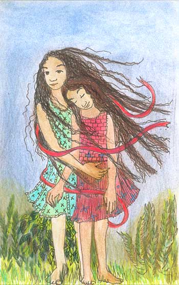 Both of them have very long hair, and they had a long ribbon sort of wrapped around themselves. The wind was blowing their hair and the ribbon, and they were just standing there next to each other, lost in thought. Like two little nymphs.
