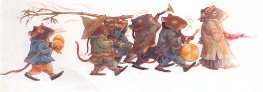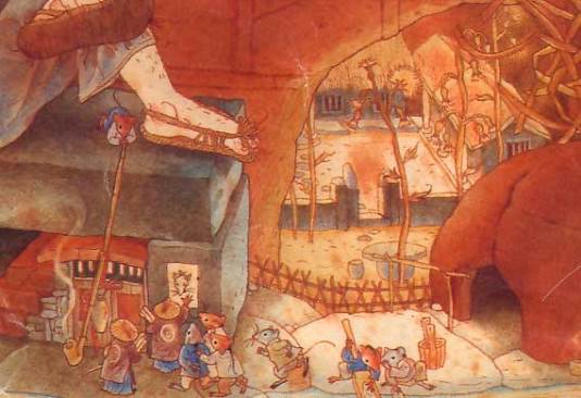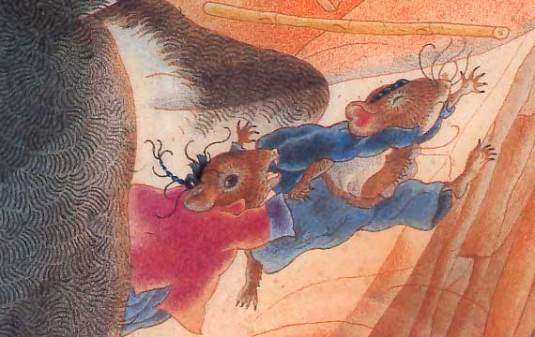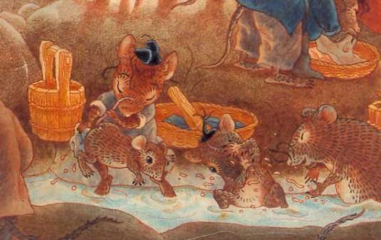 “The Mouse Bride” is a story about some mice who live in a hole in the bottom of a wall. Notice all wonderful details. In many of the pictures, you can see a small child watching everything: