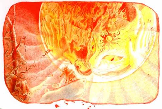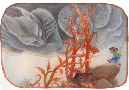 The mouse girls father asks the sun if he is the strongest. But a cloud moves in front of the sun, so clearly the cloud is stronger. The wind sweeps the cloud away, so the wind must be even stronger. And so it goes on. I love the way each potential husband is depicted as a cat. And notice how some of the images have been nibbled: