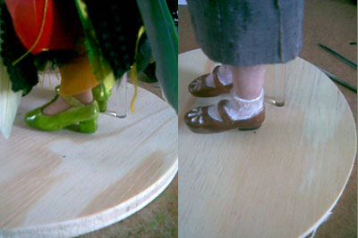 The wooden bases wont be visible – each will be covered with an appropriate surface for the puppet attached.