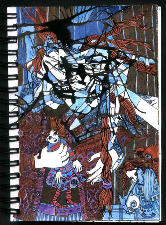 Another ink-bomb drawing. This time I started by blowing the ink around the page, and then added random lines. Pretty soon I had a broken mirror, hair, eyes, teeth, and the tantrum was inevitable: