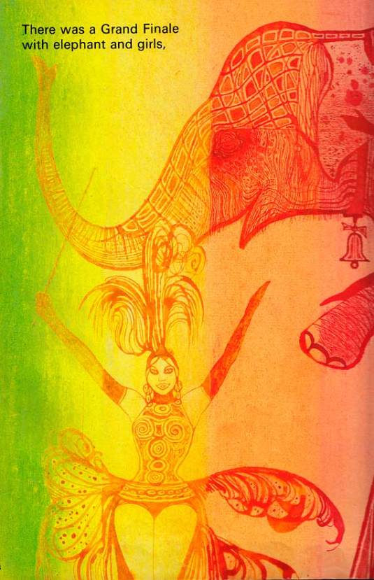 The illustrations of the circus performance are washed in rainbow colours and glowing with energy, in contrast to the dull colours of the rest of the book: