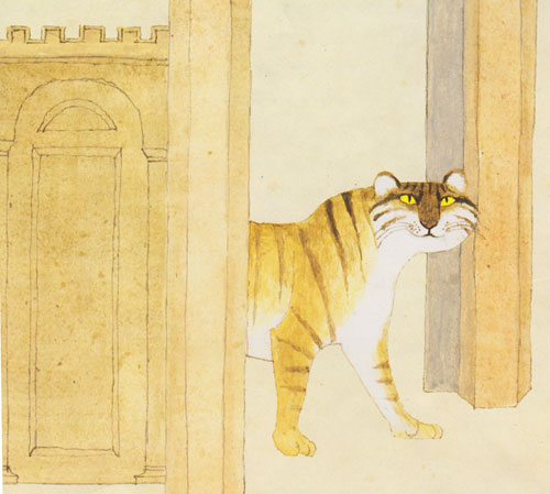 The tiger makes his appearance on many pages. Here is, “toasting his toes” in front of a fire with Blake, his housekeeper and several small friends: