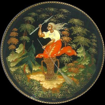 Baa Yaga’s hut on chicken legs. According to some, it has no windows or doors, very like a coffin, and it has a palisade of human bones. And you can also see her iron teeth: