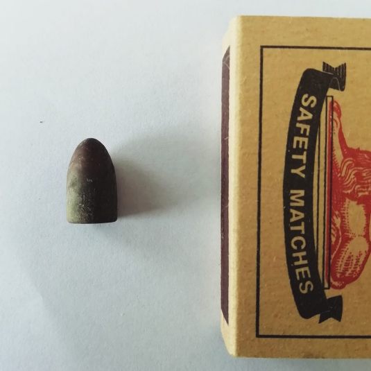 I found it behind the compost bin, next to the wall just under where the hole had been. It must have gone through the roof, and then down the outside of the wall. If it had gone just 5 cm to the right, it would have come out into my writing room and gone through the budgie cage.