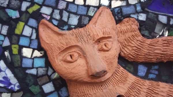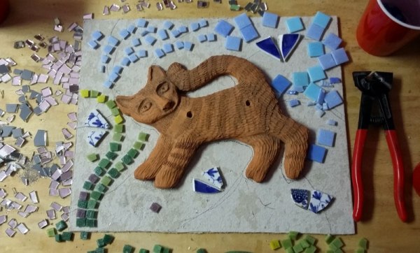 Since we are no longer renting but own our own house I can DO STUFF. Current project is to turn the concrete backyard into something a bit more lively. Mosaic in progress. Just applied grout. Tomorrow, I’ll polish it off.