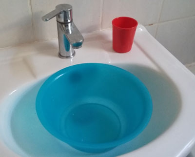 I also indulged and bought myself plastic bowls and sponges in attractive colours. It was a cheap way to lift my mood. A little bowl in every wash basin helps catch all those little trickles of water as you rinse your toothbrush, or your hands.