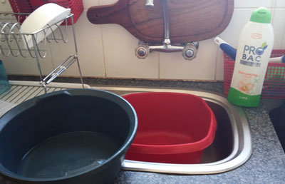Dishes get rinsed in another plastic bowl. These bowls get greasy and dirty, and that can be a health hazard. I pop the bowls, along with the washing up sponge, into the microwave and zap them for a minute or so to kill any bacteria. I also wipe the bowls out with…wait for it…vinegar. This also keeps the flies away. Also notice the Pro Bac dishwashing liquid. Using this means that I can use the greywater from washing dishes to water my plants.
