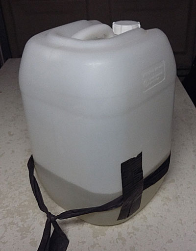 For the handle, tie some strapping around the container and secure with gaffer tape. It doesn’t look pretty, but it’s lasted surprisingly well, and makes it much easier to handle the can.