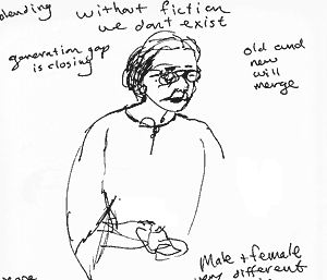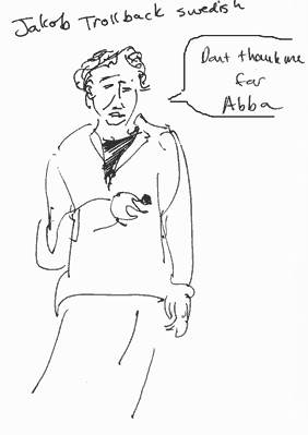There was an example of his work in the foyer of the indaba which amused me very much – its a sort of screen made of black modules, each with a very thin strip light. The lights switch on and off in patterns and its clear the thing is supposed to be responding to its environment as there are cameras embedded in some of the modules. After looking at it for some time and not being able to figure out how it was responding, I peered round the back to see a nest of wires and a rather stressed out looking individual frantically plugging and unplugging.